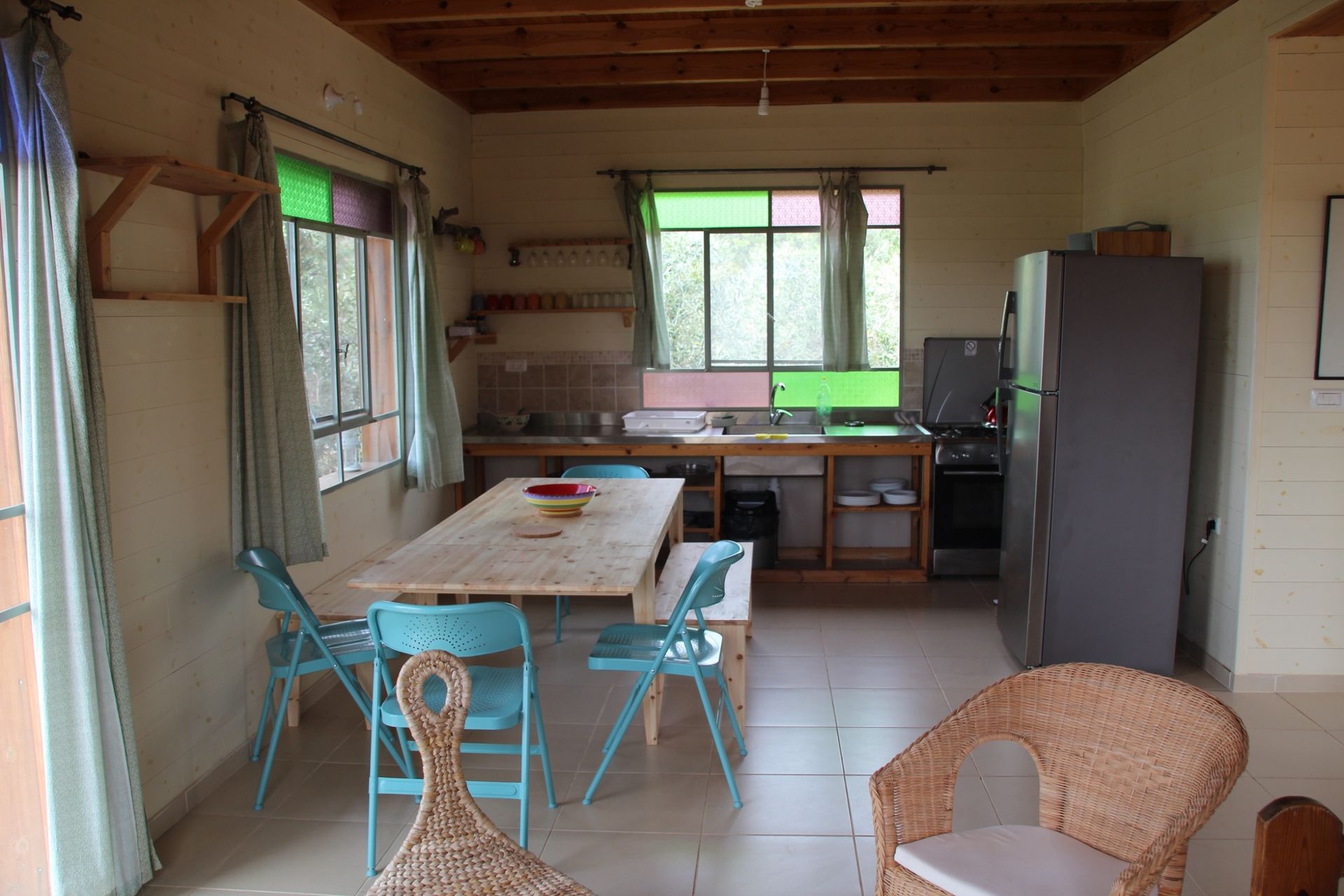 הסלון משקיף לנוף ויש בו קמין עצים. בחוץ משטח עץ גדול עם שולחן אוכל, ערסלים וכסאות נוח.